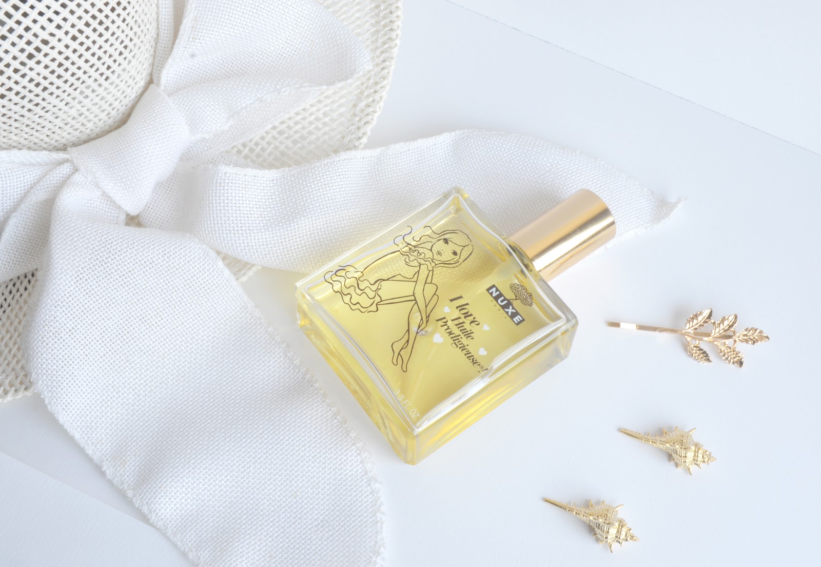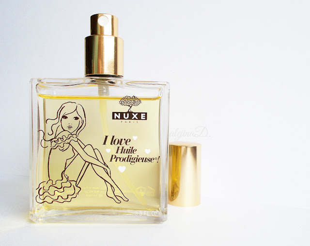 Sama sem se po preizkušanju malega, 5ml testerčka tega čudežnega olja, odločila za nakup velike 100ml različice. Izkoristila sem akcijo v lekarnah in kupila omejeno izdajo tega suhega olja, ki ima na svoji že tako luksuzni steklenički z razpršilom, umetniško narisano prikupno dekle z napisom I love Huile Prodigieuse! Sama steklenička nam daje vtis, kot da je v njej skrit božansko dišeč parfum, navsezadnje pa nas preseneti z dejstvom, da gre za suho olje. Vendar pa moram omeniti, da je vsebina stekleničke še kako dišeča. Pri Nuxu pravijo, da je olje prežeto z notami cvetovov pomarančevca pomešanega s cvetlični vonji vrtnic in magnolij ter notami naravne vanilije in cedre. Sicer se vonj na sami koži ne obdrži dolgo, kar pa sama jemljem kot prednost, kajti določenim osebam vonj morda ne bo všeč ali pa so takšni kot jaz in pri izdelkih za nego kože obraza želijo predvsem neodišavljene izdelke. Dotaknimo se še sestavinskega dela tega suhega olja. Kot aktivne sestavine na Nuxe.si spletni strani navajajo 6 dragocenih rastlinskih olj med katerimi najdemo lešnik, makadamijo, boreč, šentjanževko, kamelijo in sladki mandelj, bogato pa je tudi z vitaminom E. Vsa ta olja so znana po svojih blagodejnih učinkovinah, ki kožo vlažijo, pomirijo in nahranijo.